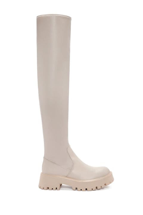 Kadın Bej Dizüstü Kalın Tabanlı Fermuarlı Casual Çizme