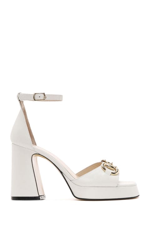 Kadın Bej Deri Bilekten Bantlı Kalın Topuklu Sandalet