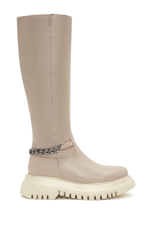 Kadın Bej Deri Fermuarlı Zincir Detaylı Çizme