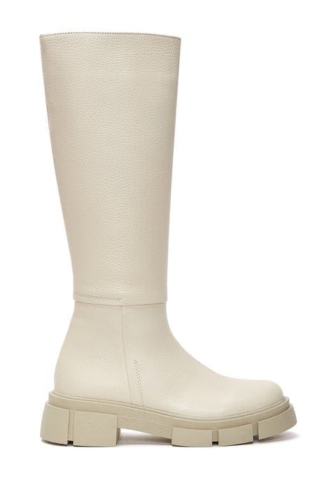 Kadın Bej Deri Fermuarlı Kalın Tabanlı Çizme