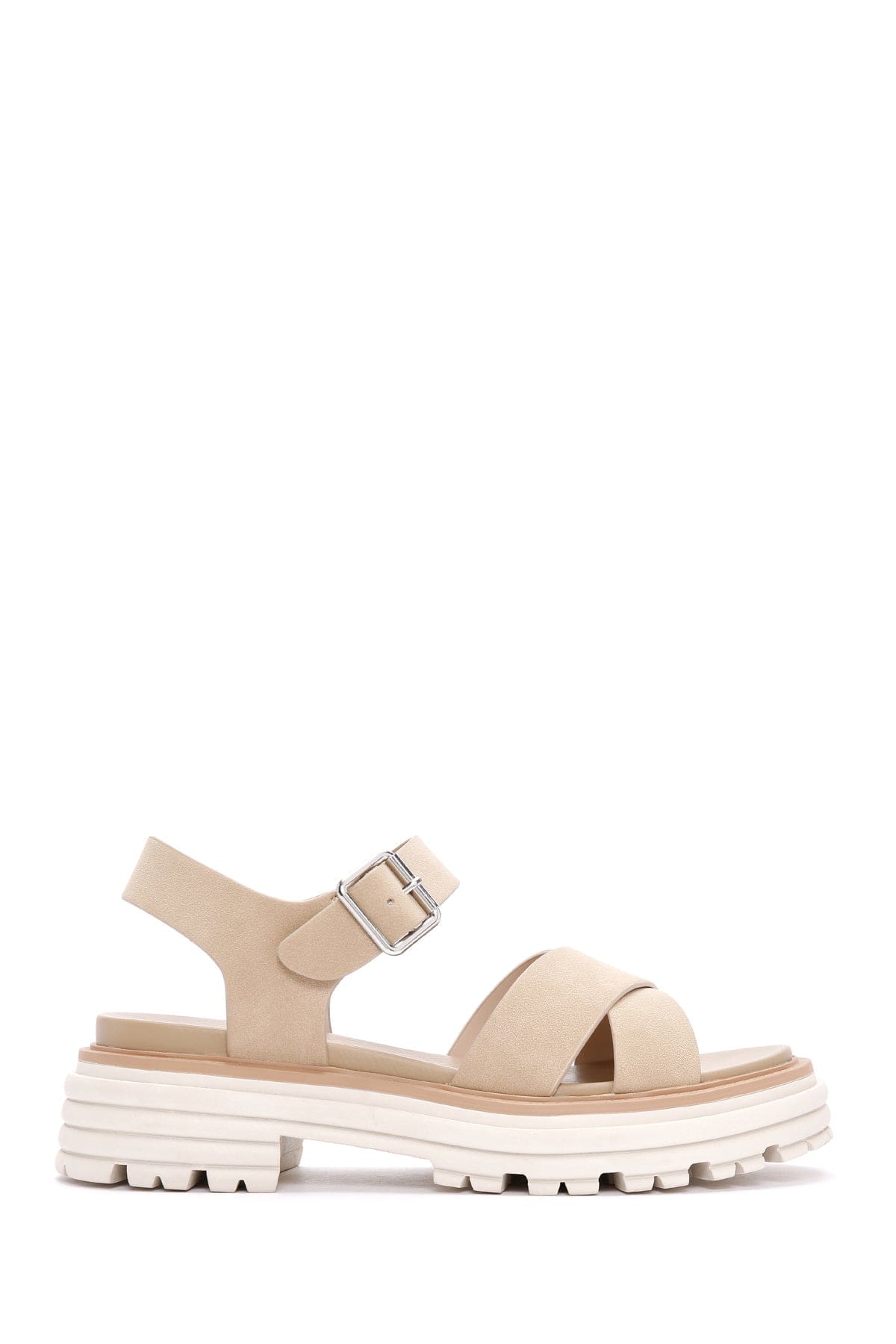 Kadın Bej Bilekten Bantlı Kalın Tabanlı Nubuk Sandalet