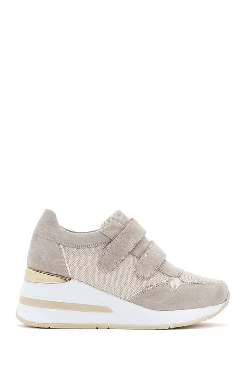 Kadın Bej Kalın Topuklu Bantlı Deri Sneaker
