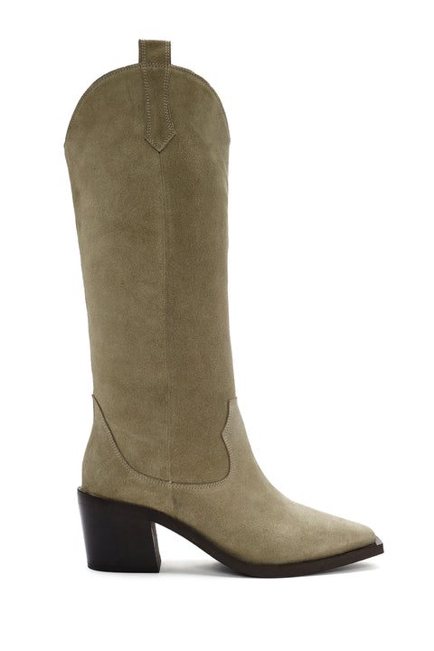 Kadın Bej Kalın Topuklu Süet Deri Kovboy Çizme