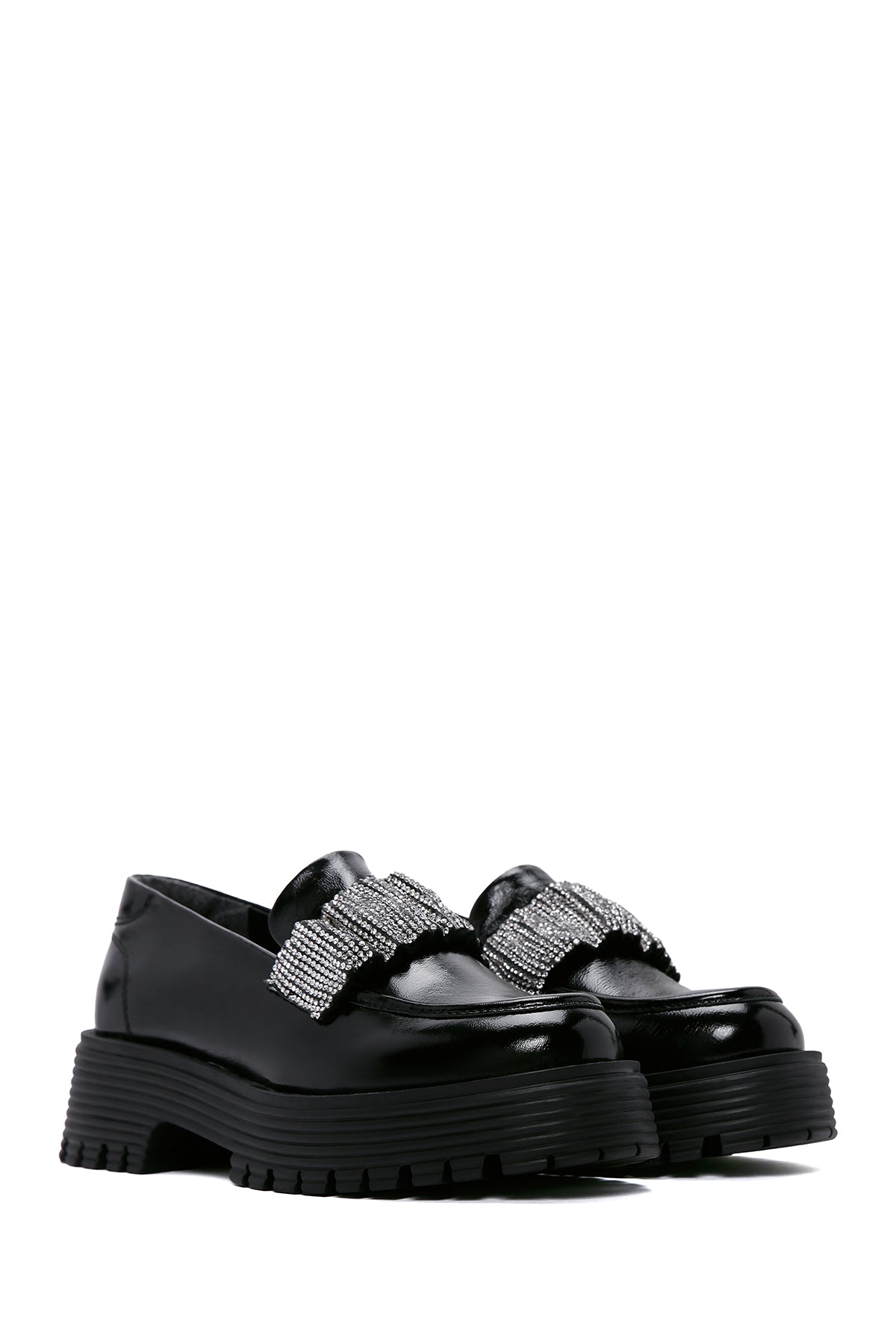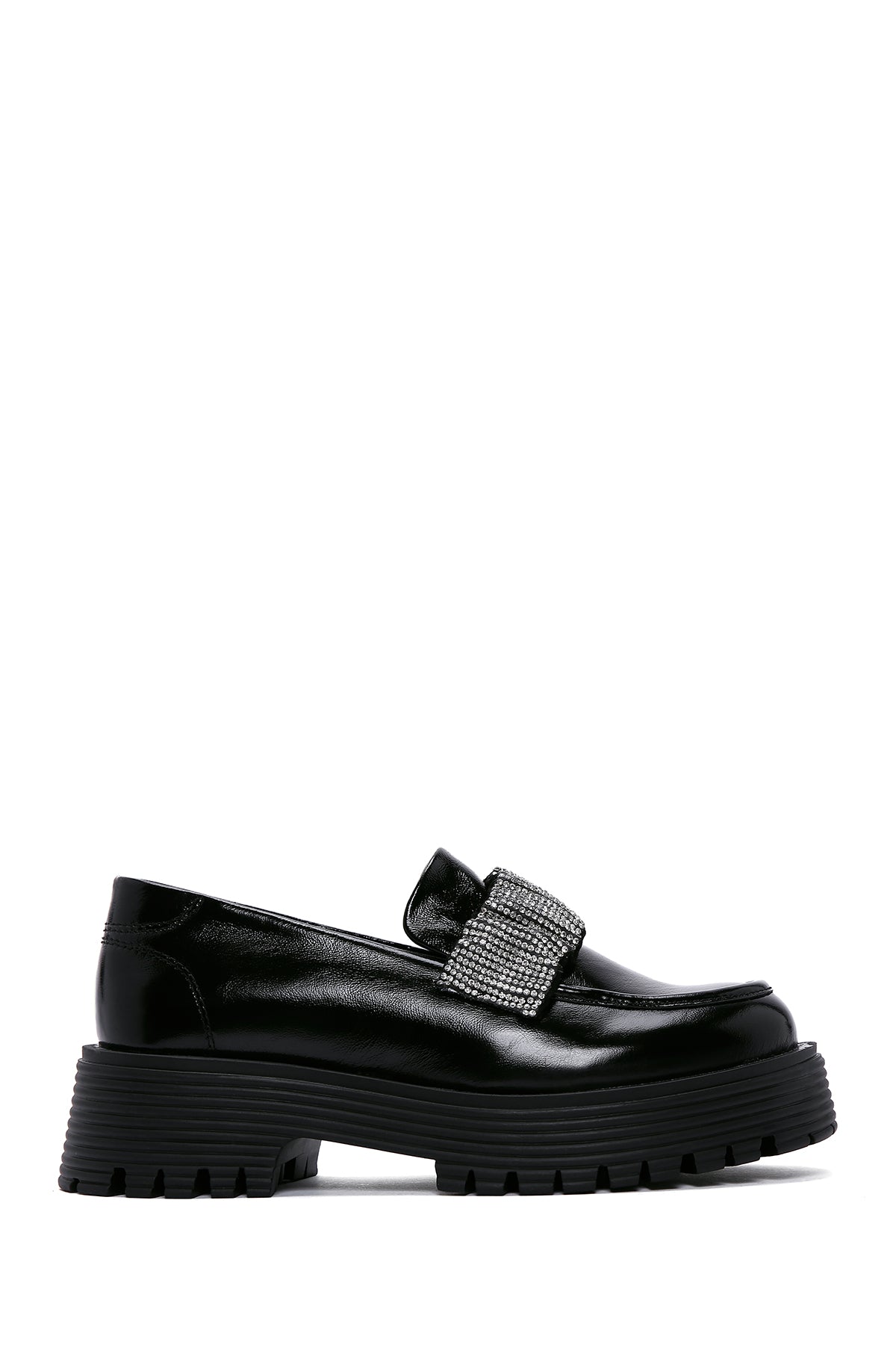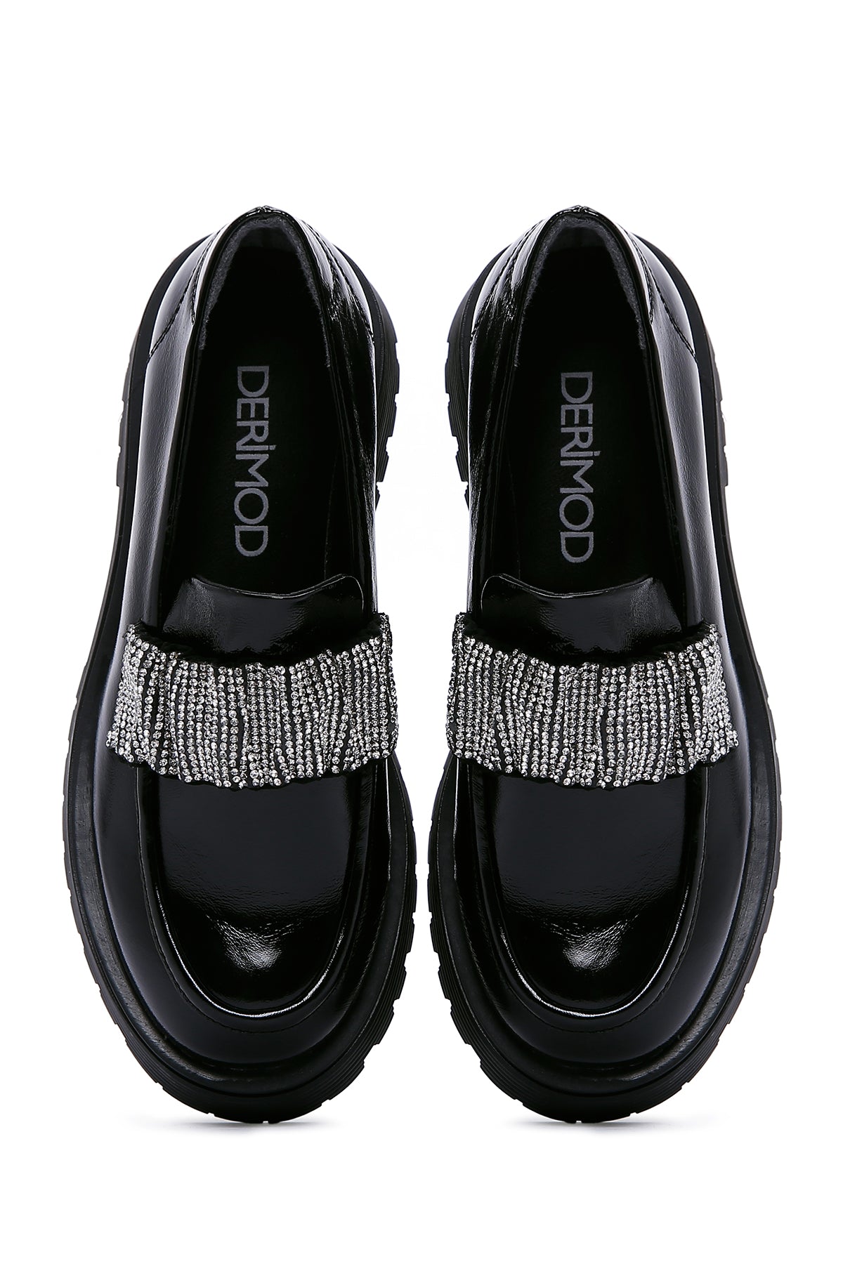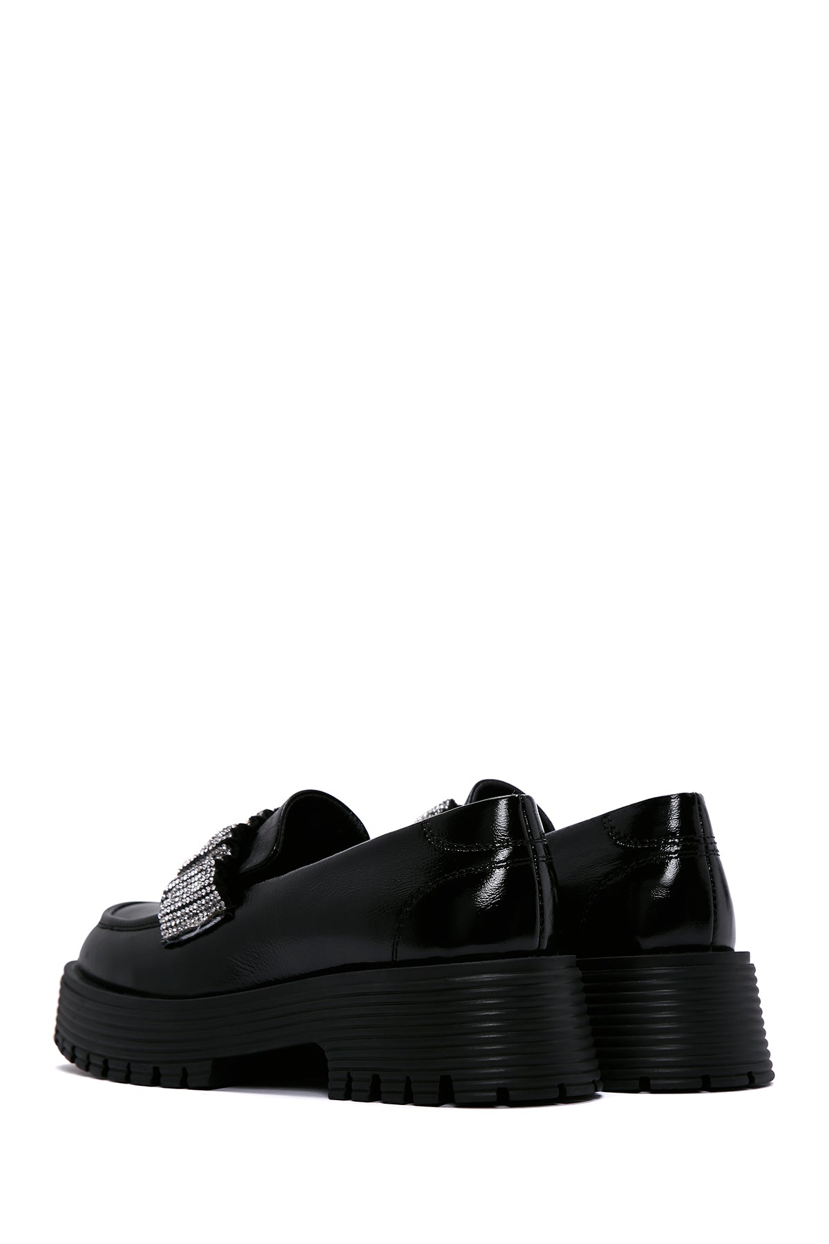 Kadın Siyah Taş Detaylı Deri Maskülen Loafer