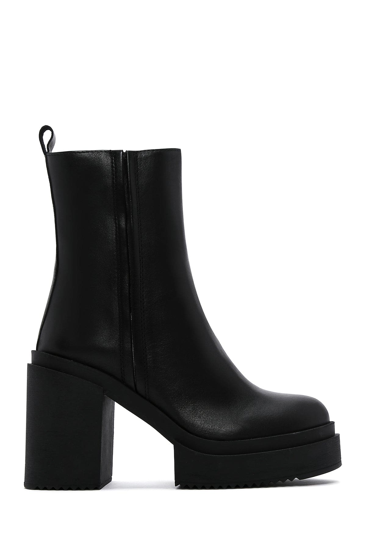 Kadın Siyah Fermuarlı Kalın Topuklu Deri Bot