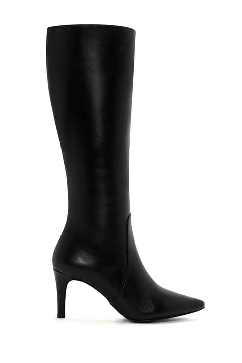 Kadın Siyah Fermuarlı İnce Topuklu Deri Çizme