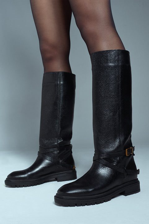 چکمه چرمی مشکی زنانه سگک دار دری مد