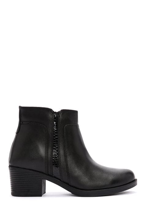 Kadın Siyah Fermuarlı Kalın Topuklu Deri Bot
