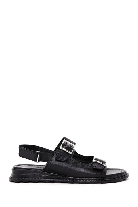 Kadın Siyah Bilekten Bantlı Çift Tokalı Deri Sandalet