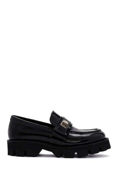 Kadın Siyah Deri Kalın Tabanlı Rugan Casual Loafer
