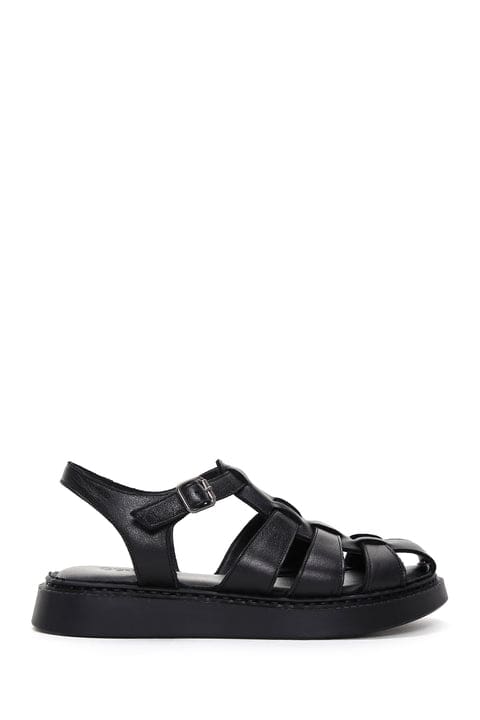 Kadın Siyah Bilekten Bantlı Deri Comfort Sandalet