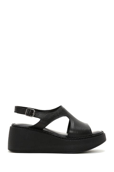 Kadın Siyah Bilekten Bantlı Dolgu Topuklu Deri Comfort Sandalet