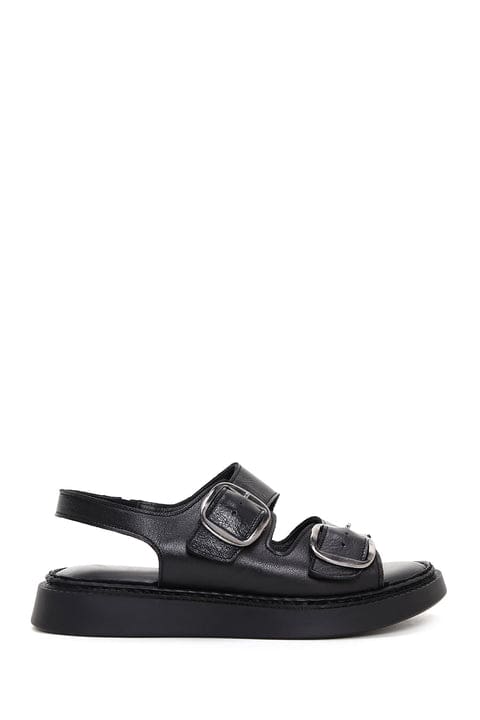 Kadın Siyah Bilekten Bantlı Çift Tokalı Deri Comfort Sandalet