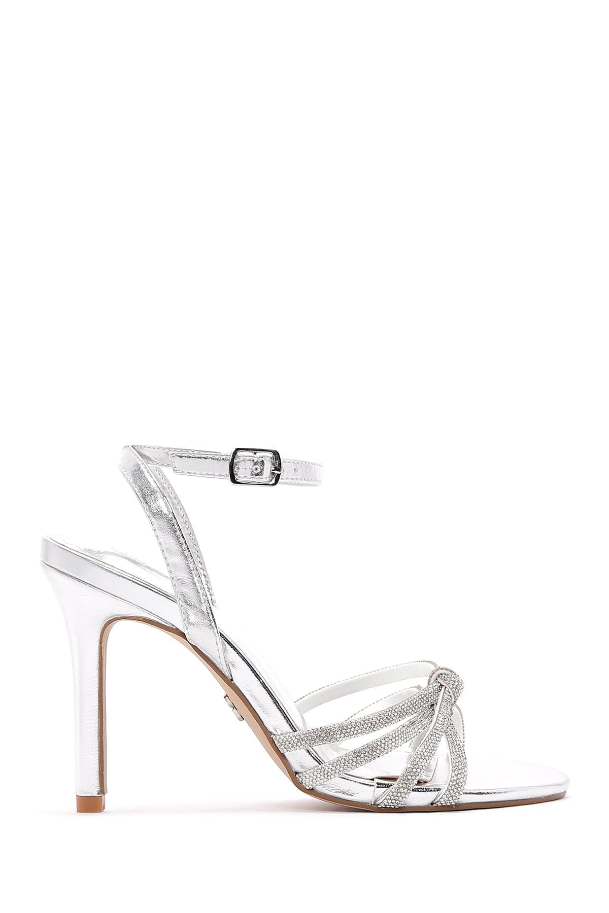 Kadın Gümüş Bilekten Bantlı Taşlı Topuklu Sandalet