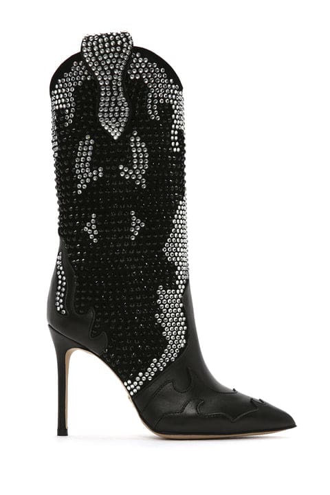 Kadın Siyah İnce Topuklu Taşlı Deri Çizme