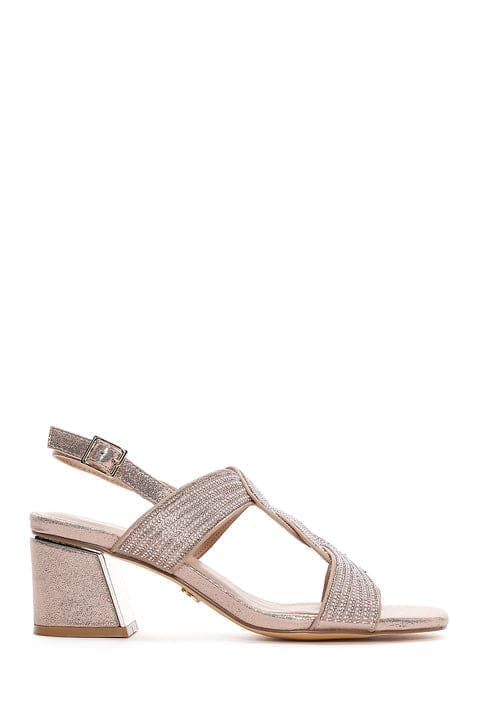 Kadın Pembe Altın Kalın Topuklu Taşlı Sandalet