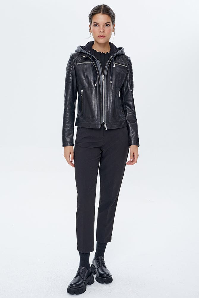 Zoom Kadın Siyah Kapüşonlu Spor Deri Ceket