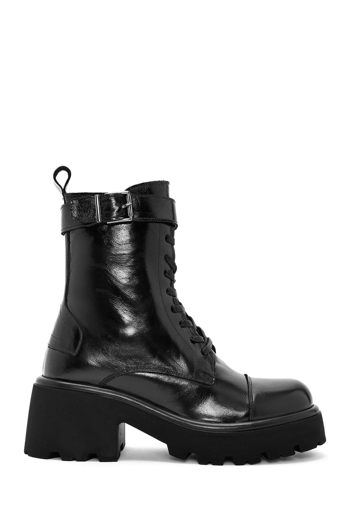 Kadın Siyah Bağcıklı Fermuarlı Kalın Tabanlı Deri Bot