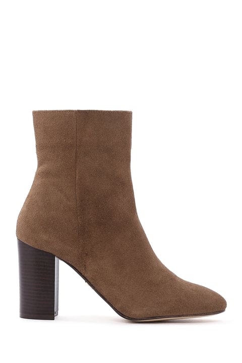 Kadın Ceviz Süet Deri Topuklu Fermuarlı Bot