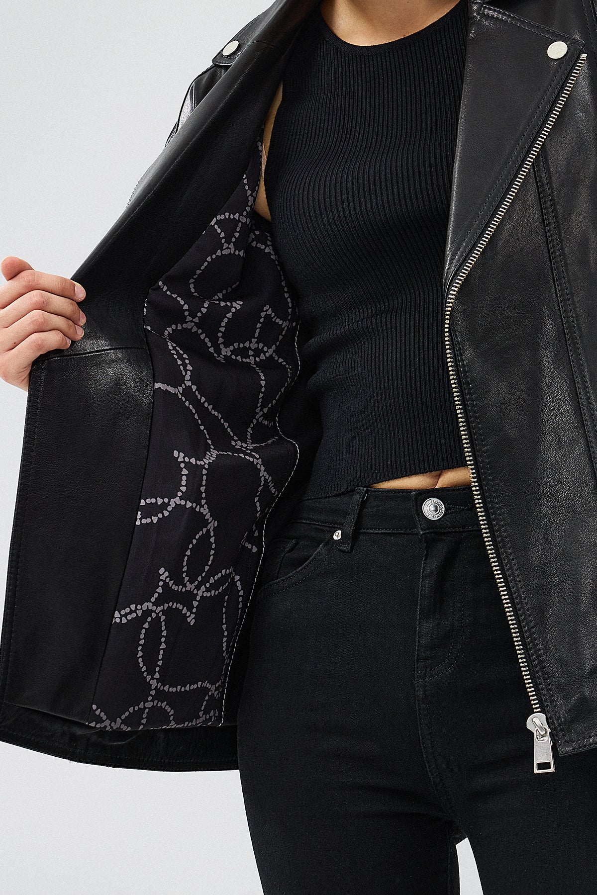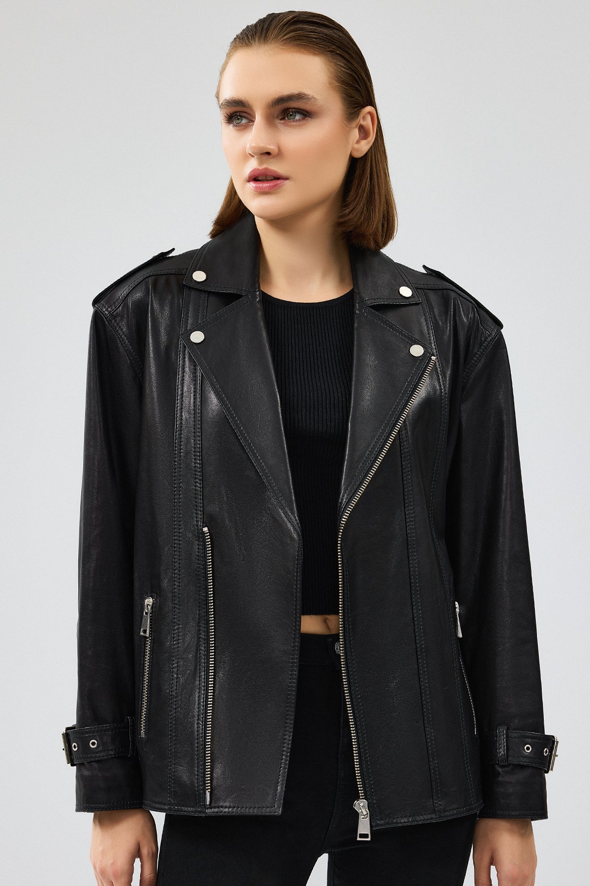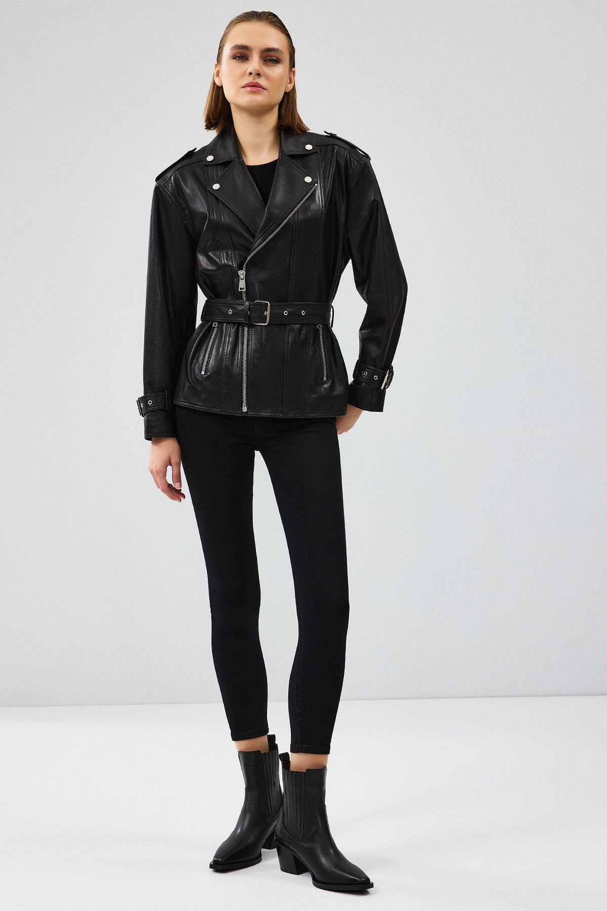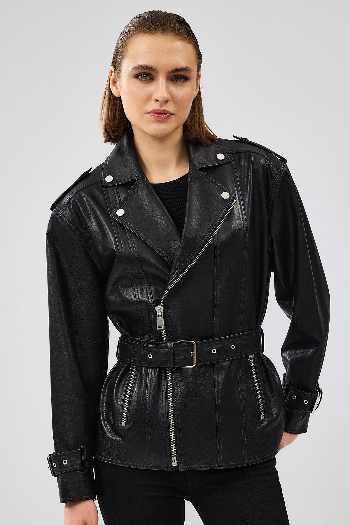 Zendaya Kadın Siyah Kemer Detaylı Biker Deri Ceket